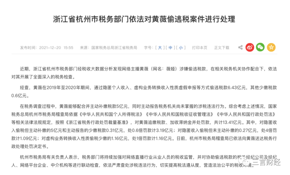 浙江省税务局发布的通报称,经税收大数据分析发现网络主播黄薇(网名:薇娅)在2019年至2020年期间,通过隐匿个人收入、虚构业务转换收入性质虚假申报等方式偷逃税款6.43亿元,其他少缴税款0.6亿元。国家税务总局杭州市税务局稽查局依法对黄薇追缴税款、加收滞纳金并处罚款,共计13.41亿元。