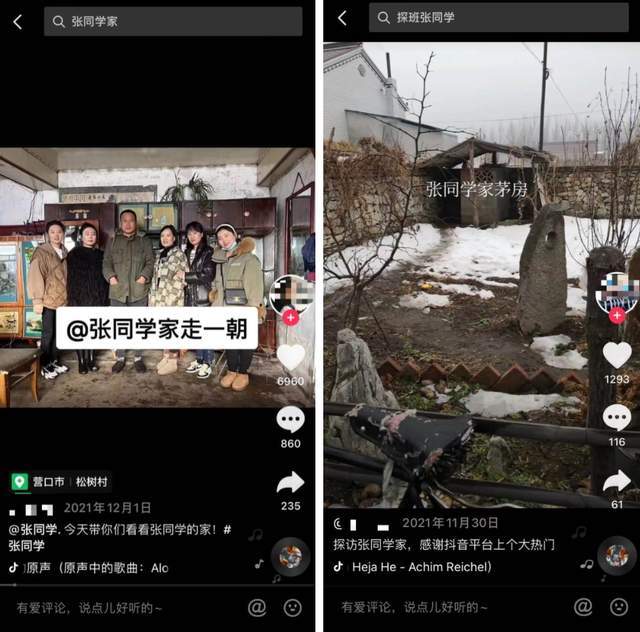 有人来找他合影,发到抖音上,再讲讲自己在张同学家的见闻,粉丝很快涨到了1万;有人来找他带货,希望他成为“东北李子柒”;有人来找他“拜师”,希望他能教教自己怎么才能火。就连“张同学”的邻居们,也越来越频繁地出现在短视频里,“揭秘”“张同学”的家长里短。