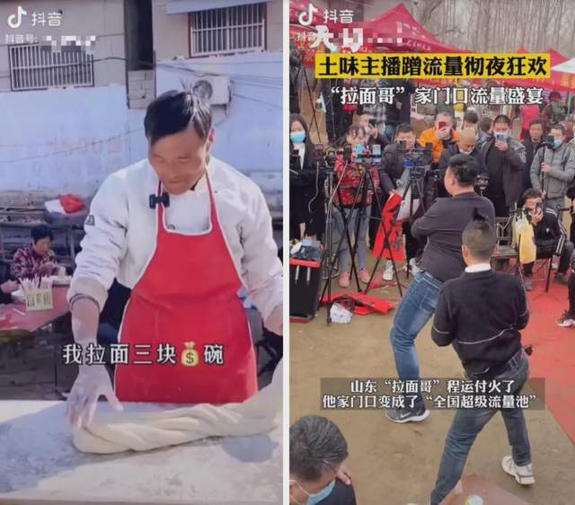 没过多久,这样的景象在几千公里外的山东再现。这次主播们围猎的,是刚刚在短视频平台意外走红的“拉面哥”。