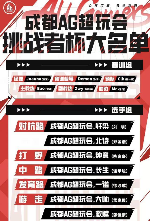 然后就是26号的晚上9点,AG对战RW侠。AG这次的大名单,我用一个词形容就是破釜沉舟。小俞,染详和小凡全都没上大名单,彻底打消了轮换的可能,救赎和北诗,都是不可能上场的了。这也就意味着AG的老五人组这次是下定决心要搏一搏了,钟意也说过是最后一舞,如果没有好的结果,或许这个组合就要成为限定版了。
