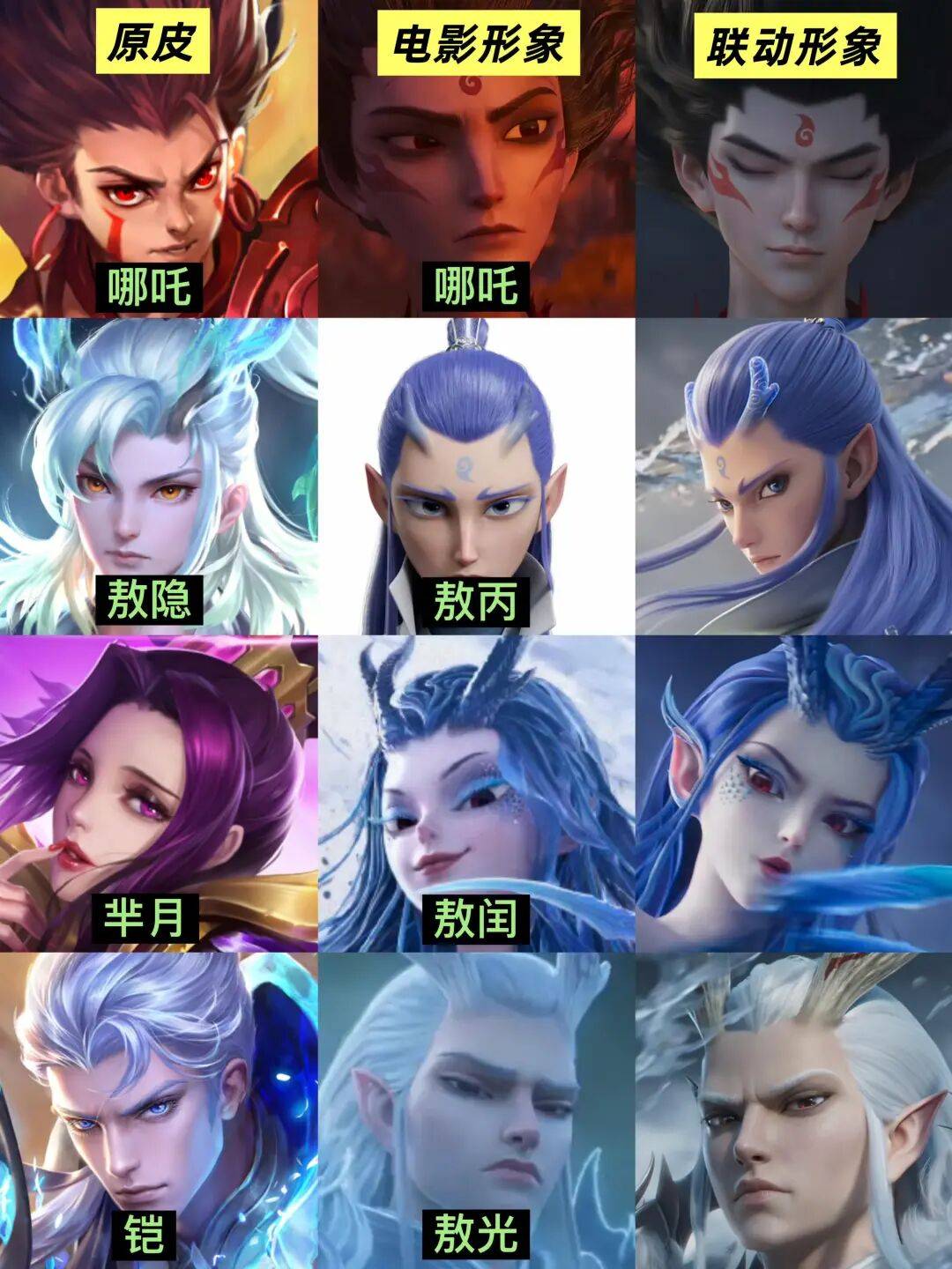 据介绍,本次联动主要是这四个英雄和角色:哪吒-魔丸·哪吒、敖隐-灵珠·敖丙、铠-东海龙王·敖光、芈月-西海龙王·敖闰。PS.另外预计还有一个小哪吒,暂时未公布具体联动对象,不确定是灵宝还是小兵典藏皮肤。