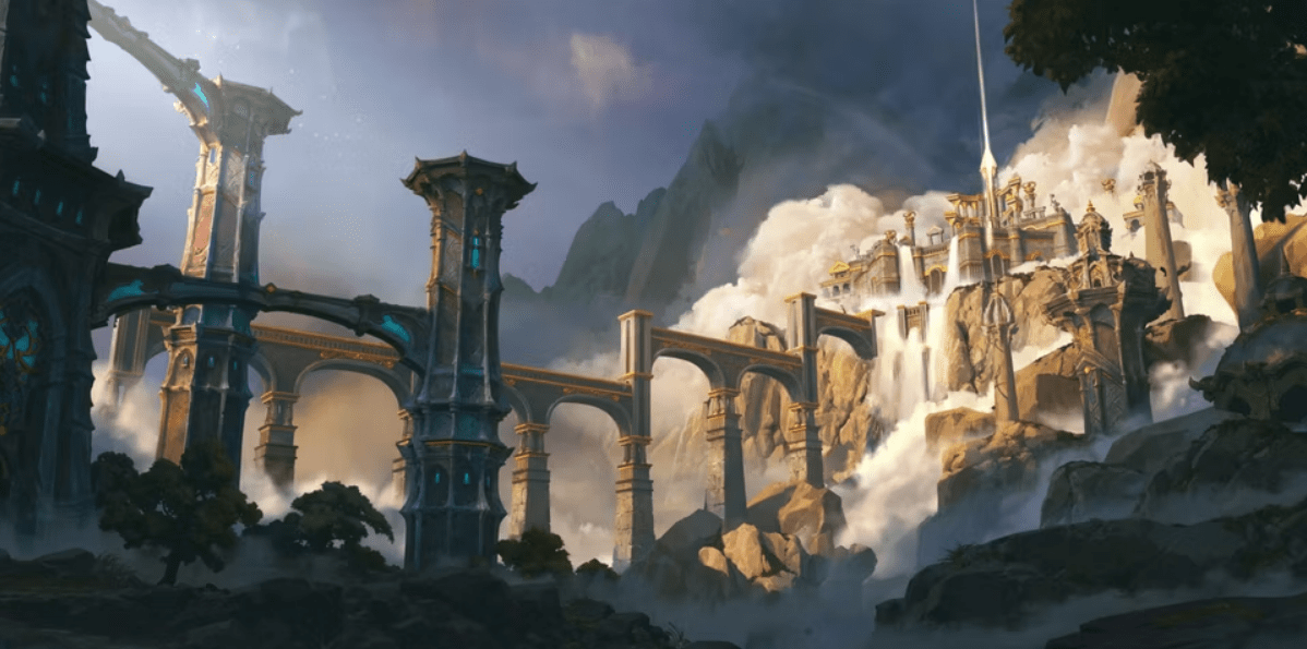 《魔兽世界》的每部资料片都要更换登陆界面,经典元素是“门”,例如原版和燃烧的远征,对黑暗之门的描绘。这次的巨龙时代有点类似巫妖王之怒(冰冠堡垒),以城墙等建筑为主。