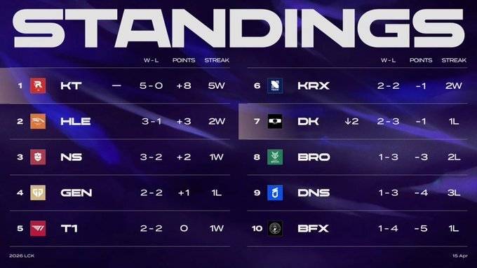 而在LCK这边,整体的局势也有点奇怪,也是乱成了一锅粥!去年灵光一现进世界赛,又进S赛决赛的KT现在是起猛了,五连胜领跑!而银河战舰的HLE则是3-1战绩,T1和GEN都是2-2,剩下竞争者还有DK和NS,感觉今年LCK更乱了!真猜不出来哪些队伍能进世界赛了!