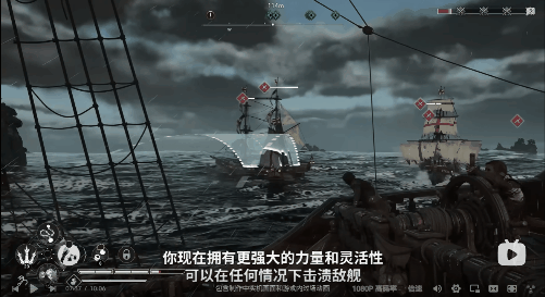 值得一提的是水体特效。《黑旗》原版就可以实现基于风力天气的动态海洋,波浪会根据海中、岸边、沙滩边缘进行单独模拟。还曾一度在GDC上被各方学习,比如《盗贼之海》就在后续运用了一些。