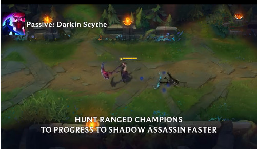 凯隐挥舞着巨大的古代镰刀,与武器中的暗裔——拉斯特,进行斗争 凯隐通过狩猎远程敌军来加速磨练暗影技术,而拉斯特通过击败近战敌军来更快满足自己的杀戮欲望 当满足其中一方的条件时,凯隐可以通过点击头像相应位置进行变身(一局游戏只能变身一次) 如果在这场对抗中,凯隐获胜,他将保持自我,成为暗影刺客 如果拉斯特获胜,他将占据凯隐的身体,成为暗裔 暗影刺客:与敌方英雄开始战斗的一段时间内攻击造成额外魔法伤害 暗裔:对英雄施法造成的伤害将部分回复自身。