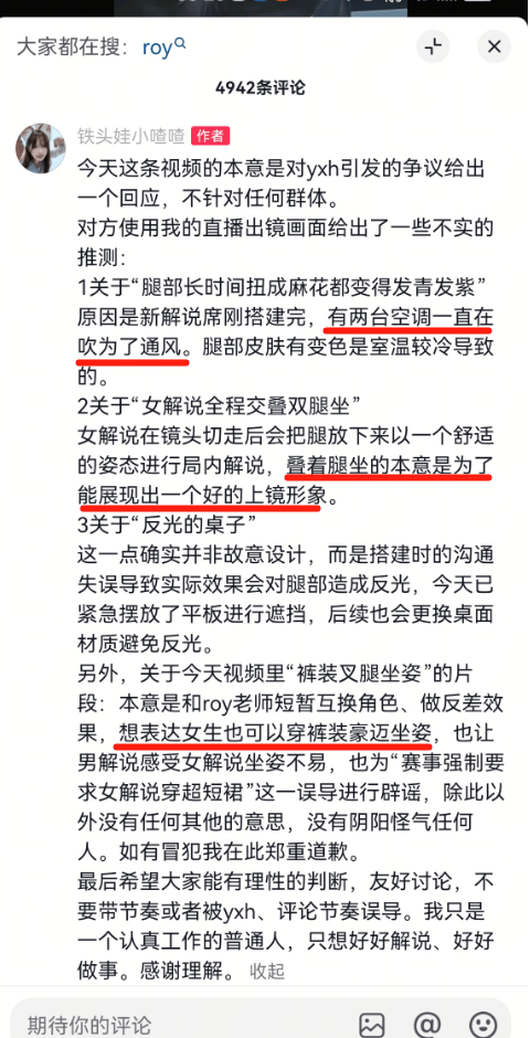 这位大姐理直气壮:“那个女解说,被官方强行要求摆斜腿坐姿”