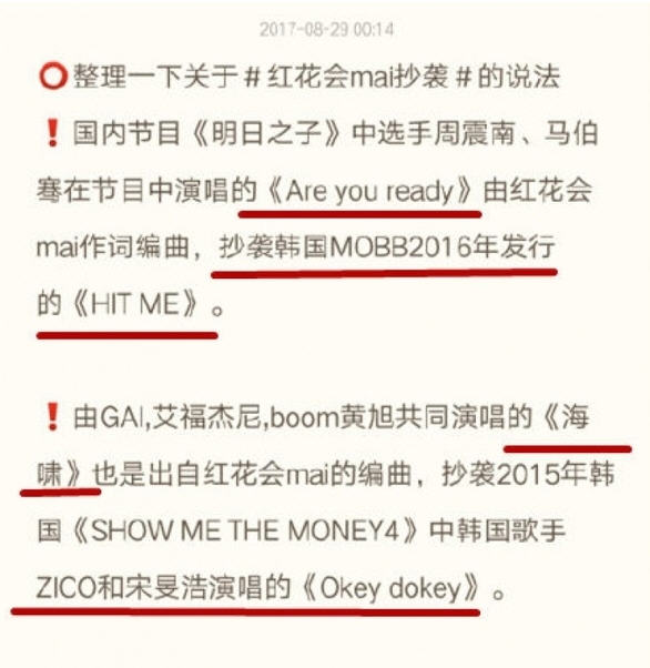 mai因为抄袭韩国艺人的曲目被推上了风口浪尖。他为《明日之子》周震南马伯骞制作的《are you ready》被质疑抄袭了韩国宋闵浩和bobby组成的临时组合mobb在2016年发行的《hit me》。另外一首为沙漠兄弟和gai编曲的《海啸》也被质疑是抄袭2015年韩国《smtm4》中宋闵浩和zico演唱的《okey dokey》。