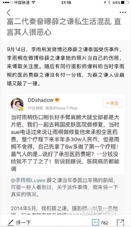 像秦奋这种富二代,本身就不差钱,也不可能去蹭热度的,曝出虚假信息的可能性几乎为零。网友们也在留言中称:“秦奋需要蹭薛之谦的热度? 别开玩笑”“薛现在根本没办法公关,因为不知道李手上到底有他多少料,薛也不好轻易发公关文,不然到时候又被打脸,所以只能等她爆完料才有办法想公关内容,可是李手上肯定不止这么点料的,等李爆完,薛也完了,进退两难啊”。