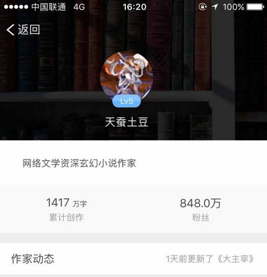 但最近突然网友发现,起点中文网中的天蚕土豆的作家等级被调整为了LV5.